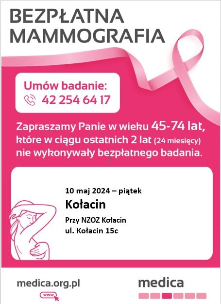 Zgodnie z wytycznymi Ministerstwa Zdrowia w ramach Narodowego Programu Zwalczania Chorób Nowotworowych zwracam się z uprzejmą prośbą do Państwa o pomoc w zorganizowaniu badań mammograficznych dla