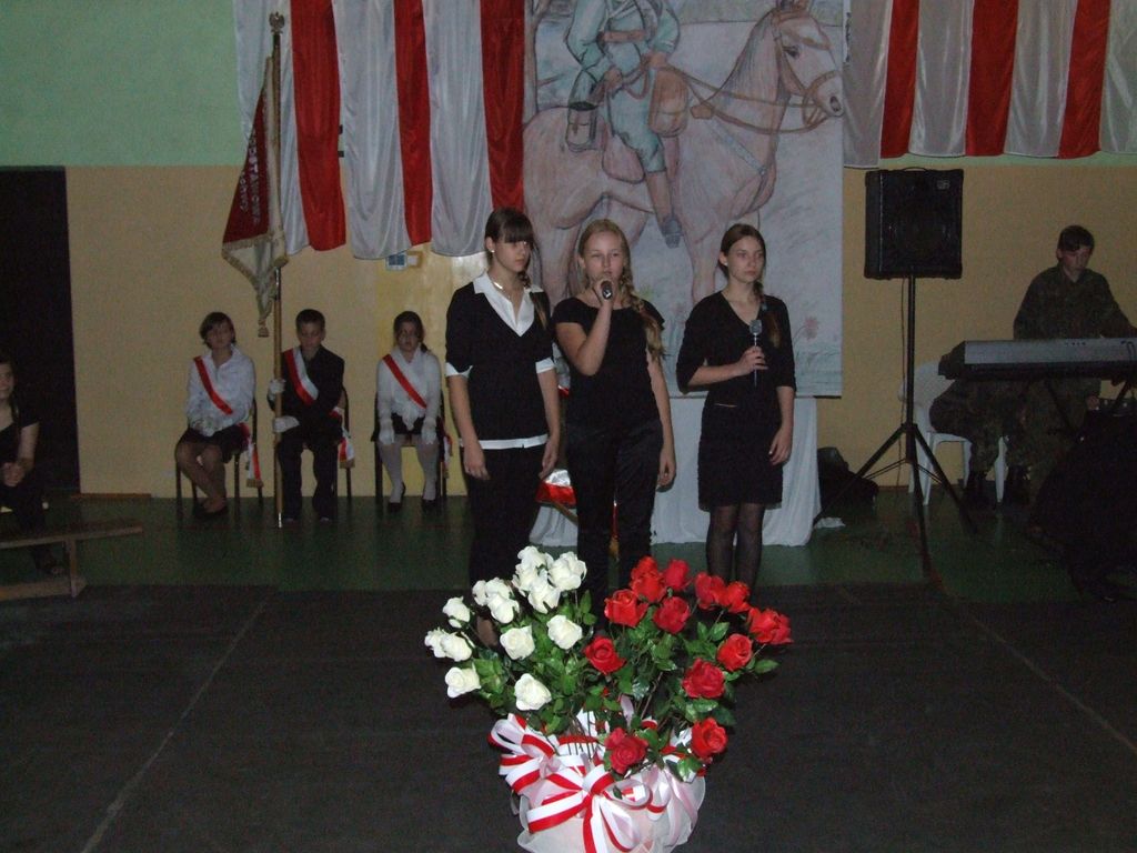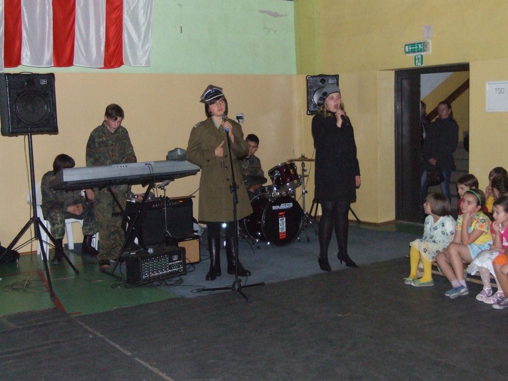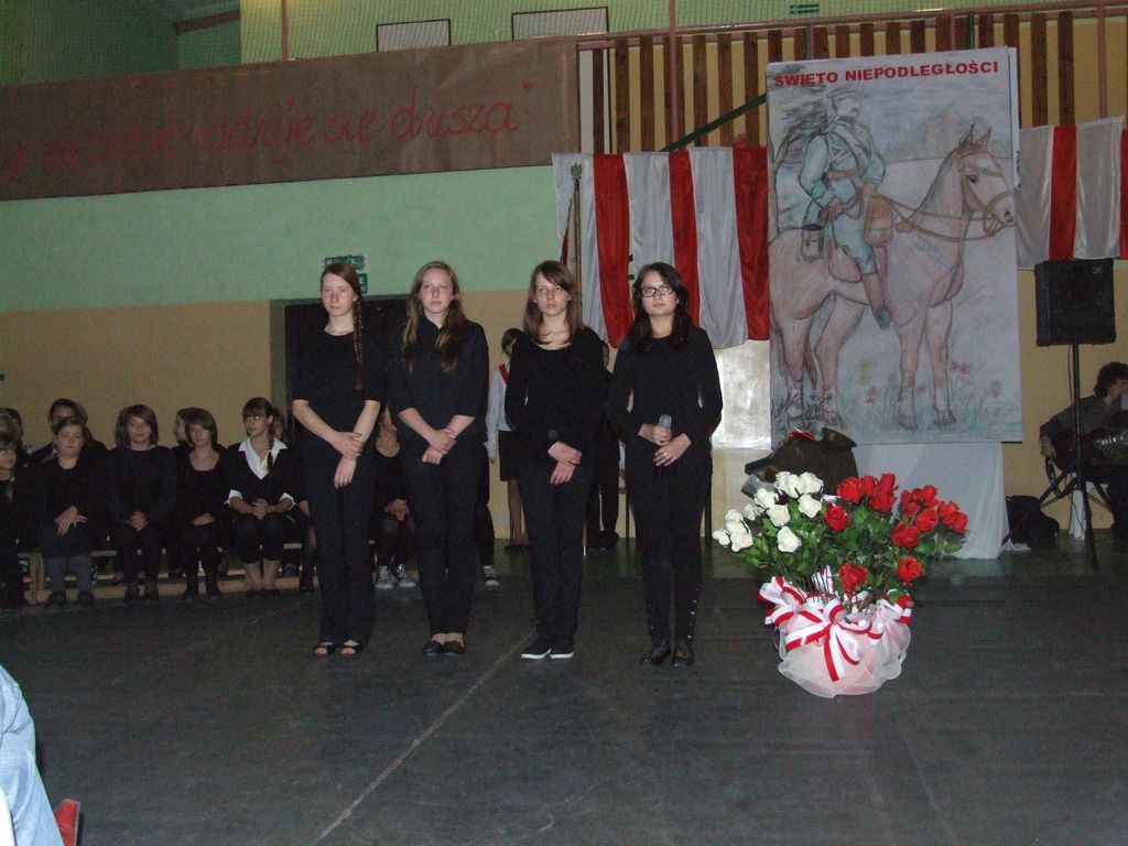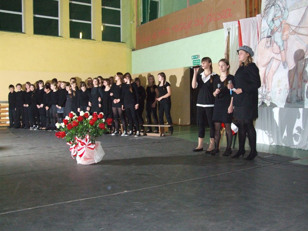 Program słowno-muzyczny był oparty w przeważającej mierze na pieśniach legionowych, które w nowej aranżacji wykonał szkolny zespół rockowy z III kl. Gimnazjum pn "Kastor" w składzie: Aleksander Nowicki, Bartłomiej Kaczmarski, Piotr Białek, Patryk Borowiak. Atmosfera była niepowtarzalna, a soliści, recytatorzy, zespół i chór szkolny ( prowadzony przez Pani mgr Ewę Kowalską ) zostali nagrodzeni owacjami na stojąco przez tłumnie przybyłych w tym dniu rodziców i zaproszonych gości.