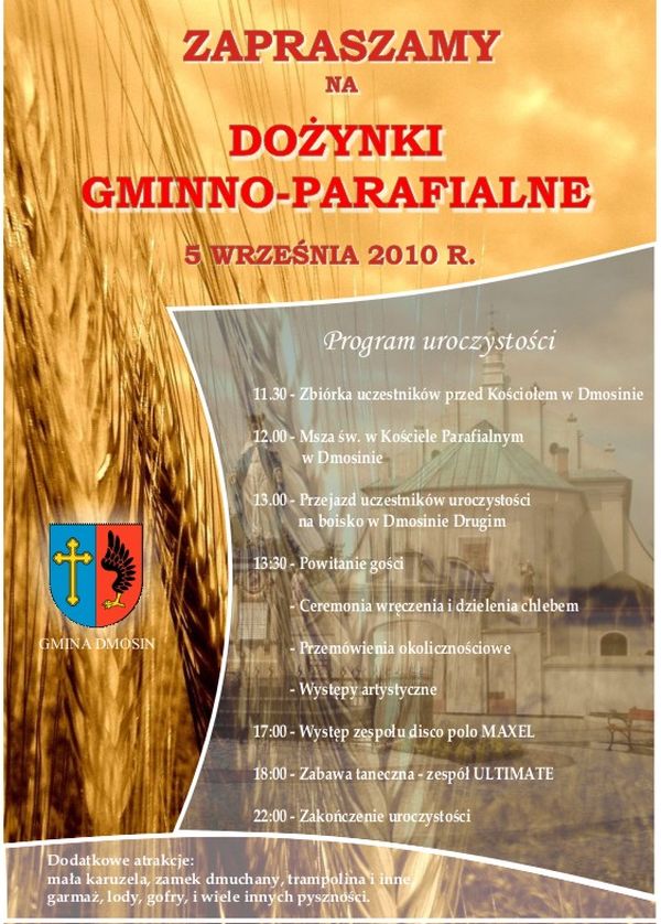 Dożynki Gminno - Parafialne 2010 Opublikowano: 24 sierpnia 2010 15:31 Kategoria: Aktualności Wydrukuj Załączniki: Plakat [108.94 KB]Wyświetleń: 2097 Zobacz również10 rocznica nadania szkole imienia Jana Brzechwy XII DNI KUKURYDZY WOJEWÓDZTW MAZOWIECKIEGO I...Powszechny Spis Rolny 2010Dożynki Gminno - Parafialne 2010 DOTACJE UNIJNE NA ROZPOCZĘCIE DZIAŁALNOŚCI...3 Dmosiński Jarmark