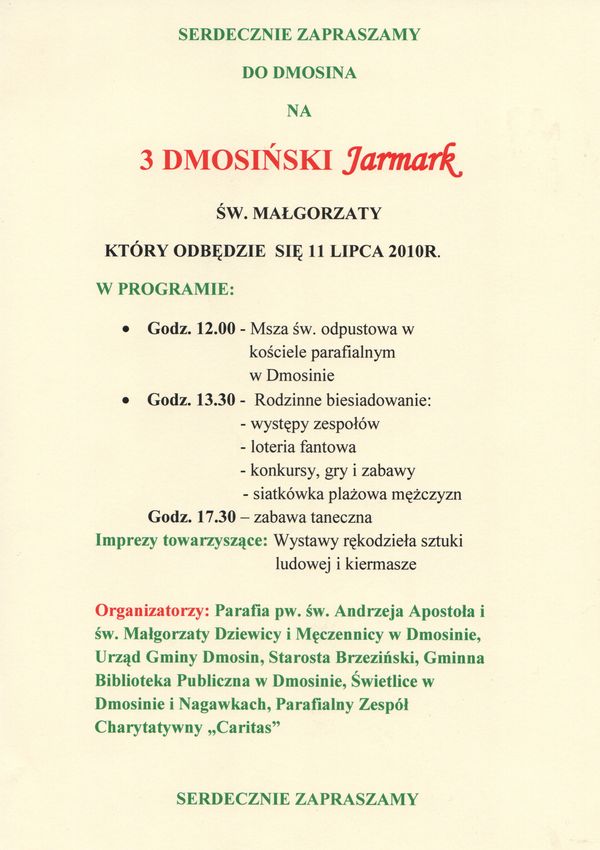 3 Dmosiński Jarmark Opublikowano: 09 lipca 2010 15:40 Kategoria: Aktualności Wydrukuj Załączniki: Plakat [61.37 KB]Wyświetleń: 1248 Zobacz równieżPowszechny Spis Rolny 2010Dożynki Gminno - Parafialne 2010 DOTACJE UNIJNE NA ROZPOCZĘCIE DZIAŁALNOŚCI...3 Dmosiński Jarmark Gmina Dmosin zakończyła realizację projektu "OKNO... Bezpłatne szkolenie dla osób odchodzących z...