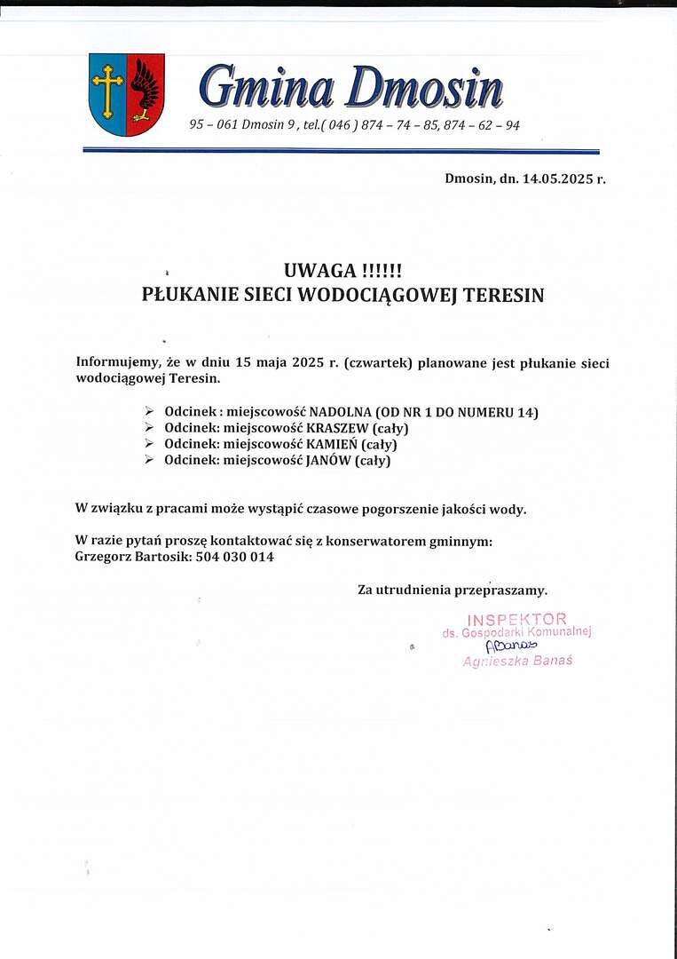 Komunikat - Płukanie sieci wodociagowej Teresin