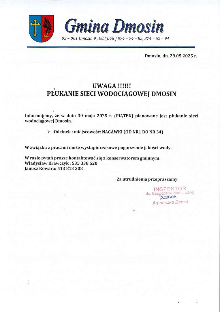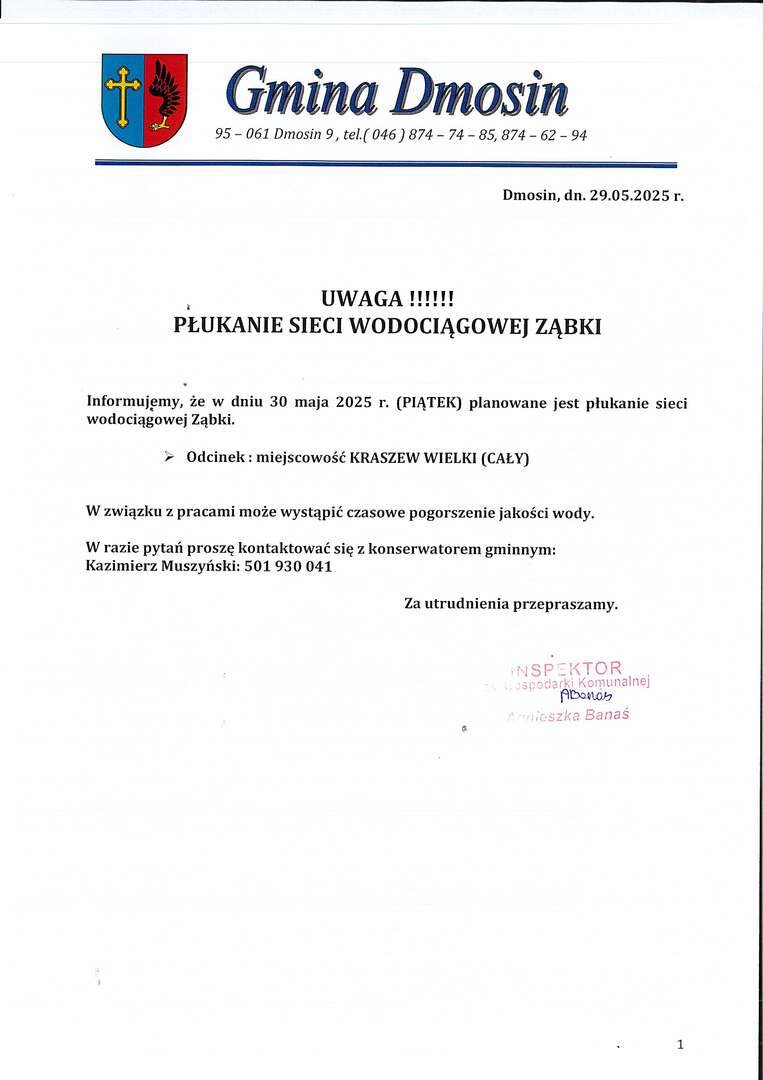 Komunikat - Płukanie sieci wodociagowej Dmosin oraz Ząbki