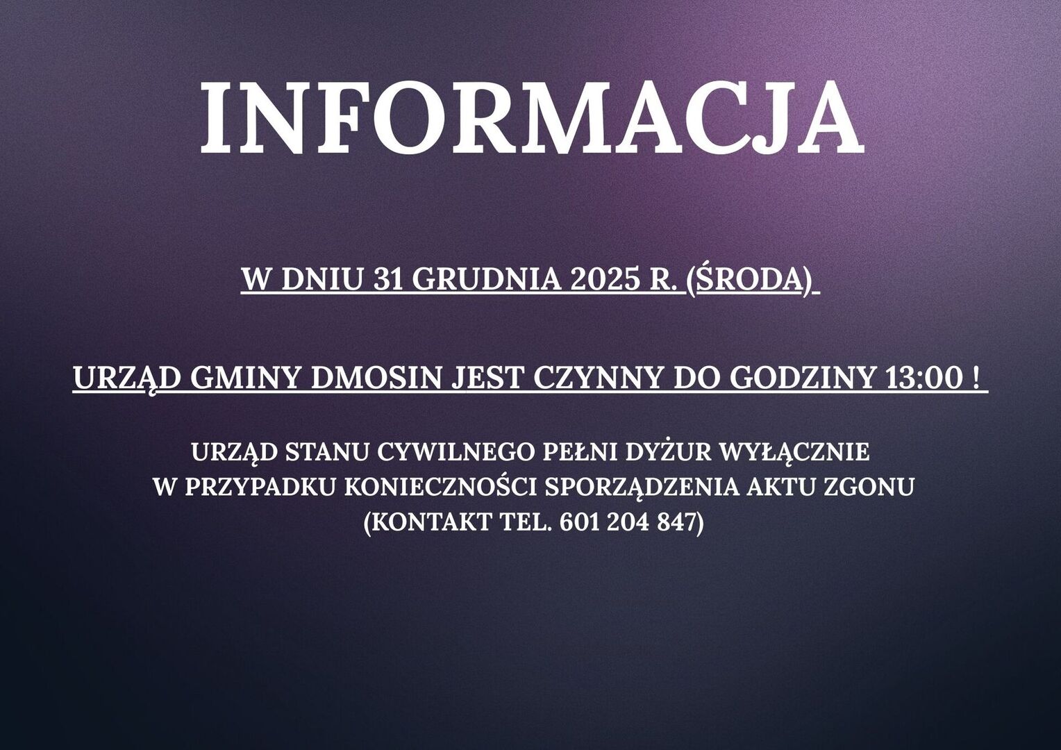 Informacja Opublikowano: 30 grudnia 2025 12:24 Kategoria: Aktualności Wydrukuj Wyświetleń: 24 Zobacz równieżInformacja Wójt Gminy Dmosin ogłasza otwarty konkurs ofert... OGŁOSZENIE o możliwości udziału w projekcie... Informacja o pracy Urzędu Gminy Dmosin w okresie...Informacja dla mieszkańców Informacja o pracy Urzędu Gminy Dmosin w dniu 18...