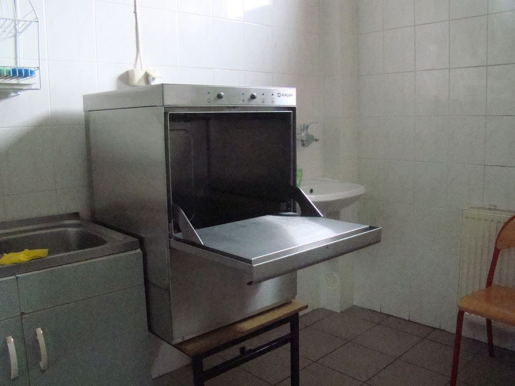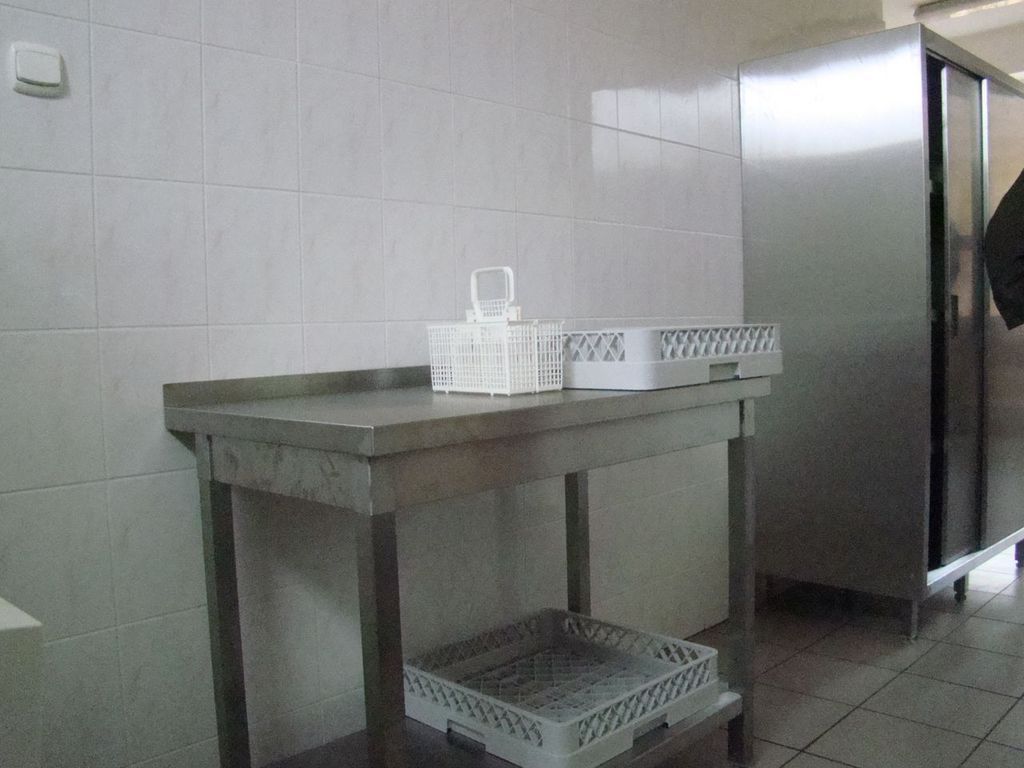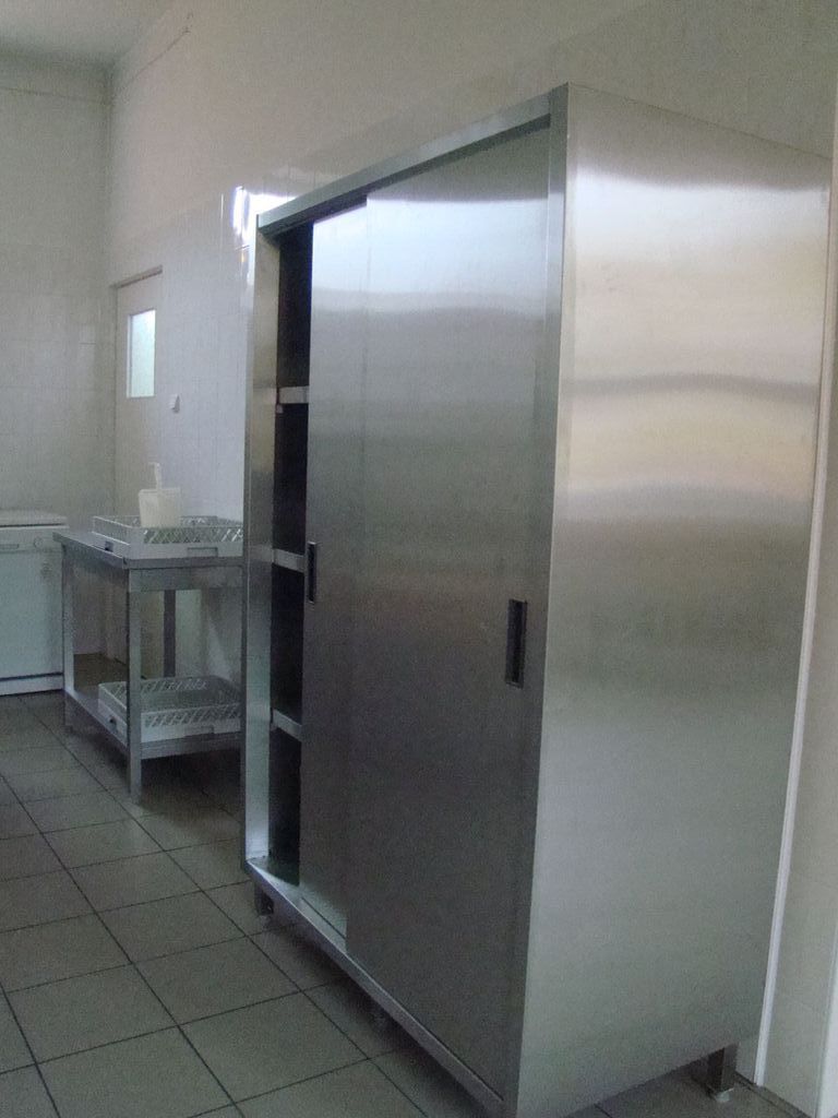 2) doposażenie kuchni: stoły przyścienne, stół ze zlewem, pojemniki termoizolacyjne, lodówkę, szafę chłodniczą, szatkownice do warzyw, regał magazynowy, zestawy naczyń dla dzieci, zestaw przyborów kuchennych, sztućce, garnki;