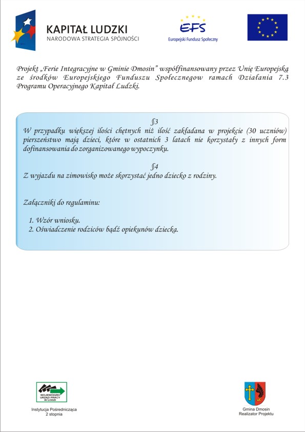 Ferie integracyjne w Gminie Dmosin Opublikowano: 01 stycznia 2009 10:08 Kategoria: Inwestycje gminne Wydrukuj Załączniki: ferie.jpg [105.45 KB] regulamin1.jpg [112.8 KB] regulamin2.jpg [64.15 KB] Wzór wniosku [141.57 KB]Wyświetleń: 2122 Zobacz również Przebudowa drogi gminnej Szczecin - Osiny"... Spotkania integracyjne w świetlicach na terenie...Integracyjne lato w Gminie DmosinFerie integracyjne w Gminie DmosinBezpłatne szkolenia dla mieszkańców ZAJĘCIA POZALEKCYJNE W SZKOŁACH NA TERENIE GMINY...