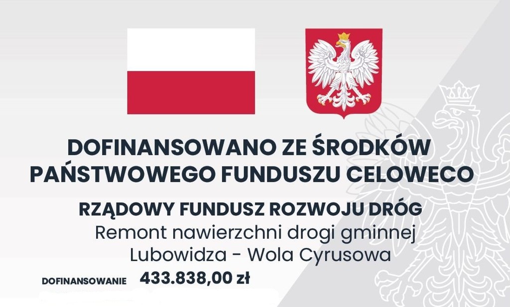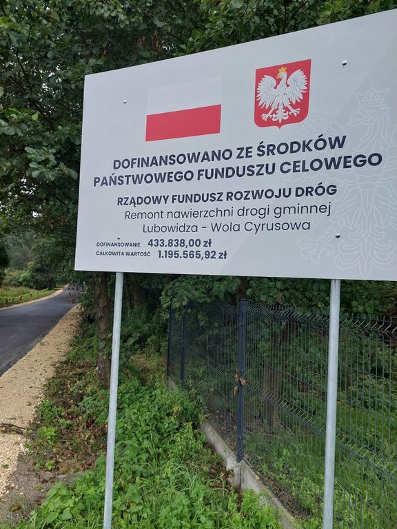 Gmina Dmosin zakończyła realizację inwestycji współfinansowanej w ramach Rządowego Funduszu Rozwoju Dróg pn.: „Remont nawierzchni drogi gminnej Lubowidza–Wola Cyrusowa”.