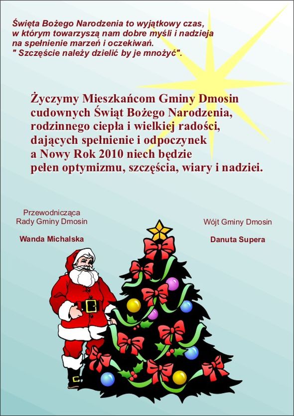 Życzenia świąteczne Opublikowano: 18 grudnia 2009 08:40 Kategoria: Aktualności Wydrukuj Załączniki: zyczenia2009.jpg [86.18 KB]Wyświetleń: 5723 Zobacz również Bezpłatne szkolenia w ramach projektu "Spotkania...Powiatowy Urząd Pracy w BrzezinachI Noworoczny Turniej Piłki Siatkowej DziewczątŻyczenia świąteczne Gmina Dmosin organizuje szkolenia z Europejskiego...Gmina Dmosin - Gmina Fair Play 2009