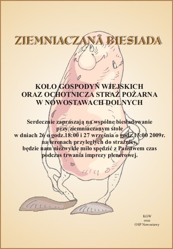 Ziemniaczana Biesiada Opublikowano: 24 września 2009 09:25 Kategoria: Aktualności Wydrukuj Załączniki: plakat [72.52 KB]Wyświetleń: 1942 Zobacz równieżI sukces siatkarek "Piórkowskich" z gminy DmosinZ okazji Święta Edukacji NarodowejMistrzostwa Polski Branży Mięsnej w piłce nożnejZiemniaczana BiesiadaŚwięto ziemniaka Gmina Dmosin prowadzi rekrutacje uzupełniającą do...
