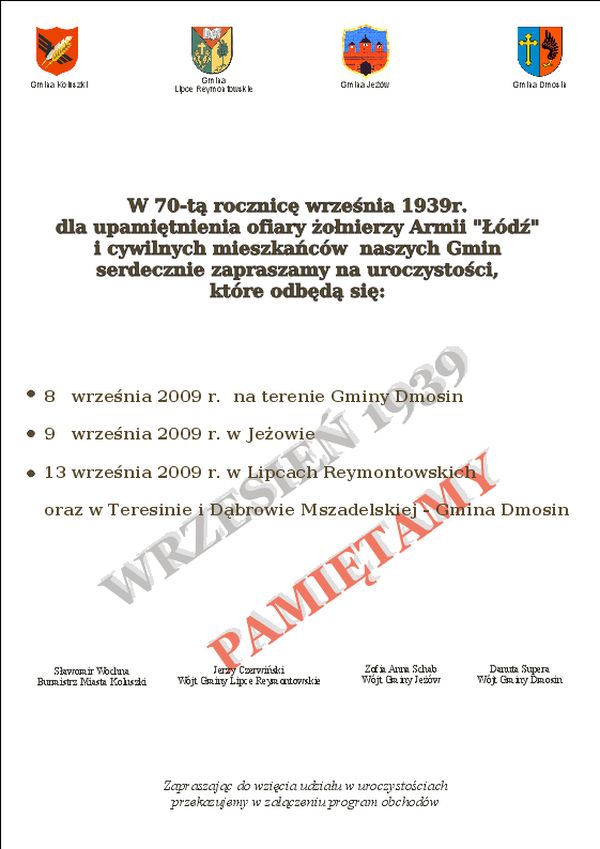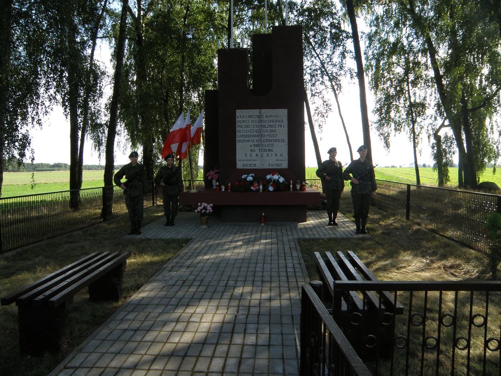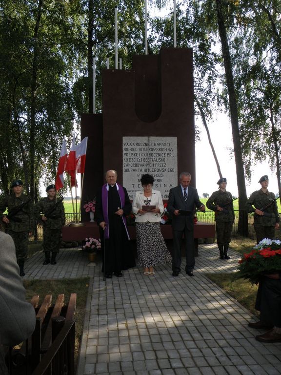 W dniu 13 września br. wszystkie grupy gimnazjalistów / z Jeżowa, Dmosina, Lipiec Reymontowskich oraz Koluszek/ spotkały się w Lipcach Reymontowskich na cmentarzu parafialnym. Młodzież złożyła kwiaty i zapaliła znicze na mogiłach ofiar mordu w Dąbrowie Mszadelskiej i Teresinie. Uczniowie zwiedzili również ekspozycje w Muzeum Czynu Zbrojnego w Lipcach Reymontowskich. Następnie zostali przewiezieni autokarami na uroczystości patriotyczne do Teresina . W Teresinie wszystkich zebranych powitała Wójt Gminy Dmosin Danuta Supera oraz Wójt Gminy Lipce Reymontowskie Jerzy Czerwiński. Oprócz młodzieży uczestniczącej w rajdach na uroczystość przybyli: Wicestarosta Skierniewicki Pan Jarosław Liński, Przewodniczący Rady Powiatu Skierniewickiego - Pan Zdzisław Tuleja , Przewodnicząca Rady Gminy Lipce Reymontowskie Pani Danuta Łaska, Przewodnicząca Rady Gminy Dmosin - Pani Wanda Michalska, Proboszcz Parafii Lipce Reymontowskie- Ksiądz Franciszek Urbaniak, Wójt Gminy Jeżów Pani Zofia Schab, Radni Rady Gminy Dmosin i Rady Gminy Lipce Reymontowskie , sołtysi , Dyrektorzy Szkół, rodziny zamordowanych mieszkańcy Teresina , Sicisk i Dąbrowy Mszadelskiej i okolicznych miejscowości Gminy Dmosin i Gminy Lipce Reymontowskie, Kombatanci, strażacy z Gminy Lipce Reymontowskie i Gminy Dmosin wraz pocztami sztandarowymi. Obecny był również Pan Paweł Goździński autor książki opisującej tragiczne wydarzenia września 1939 r. na terenie naszych gmin pt. "1939 8-10 Września Dmosin - Jeżów-Koluszki - Lipce Reymontowskie". Przed uroczystością przy pomniku w Teresinie i Dąbrowie Mszadelskiej zaciągnęła warty honorowe młodzież ze Szkoły Ponadgimnazjalnej z Godzianowa. Po przemówieniu okolicznościowym wygłoszonym przez Wójta Gminy Dmosin Danutę Supera i Wójta Gminy Lipce Reymontowskie Jerzego Czerwińskiego, Proboszcz Parafii Lipce Reymontowskie- Ksiądz Franciszek Urbaniak odmówił modlitwę w intencji pomordowanych w Teresinie. Następnie wszyscy uczestnicy uroczystości przeszli pod pomnik w Dąbrowie Mszadelskiej, gdzie 10 września 1939 roku Żołnierze Wehrmachtu pod dowództwem generała Conrada von Cochenhausena spalili w stodole w okrutny sposób 153 bezbronne osoby. Przy kapliczce wzniesionej w miejscu zbrodni Proboszcz Parafii Lipce Reymontowskie - Ksiądz Franciszek Urbaniak odprawił Mszę św. polową w intencji pomordowanych mieszkańców. Po Mszy św. odbyła się część artystyczna w wykonaniu młodzieży z Gimnazjum w Lipcach Reymontowskich i Zespołu Szkół Samorządowych w Dmosinie. W trakcie dalszej części uroczystości Wójtowie Gmin: Jeżów Pani Zofia Schab, Lipce Reymontowskie - Pan Jerzy Czerwiński, Dmosin - Pani Danuta Supera oraz przedstawiciel Burmistrza Koluszek Pana Sławomira Wochny przekazali nagrody dla młodzieży uczestniczącej w rajdzie w dniu 13 września 2009 r.. Każdy otrzymał książkę autorstwa Pana Pawła Goździńskiego opisującą tragiczne wydarzenia września 1939 r. pt. "1939 8-10 Września Dmosin- Jeżów-Koluszki - Lipce Reymontowskie" .Podczas uroczystości wszyscy mieli możliwość obejrzenia wystawy okolicznościowej przygotowanej Przez Pana Jerzego Murgrabię - Muzeum Czynu Zbrojnego z Lipiec Reymontowskich.