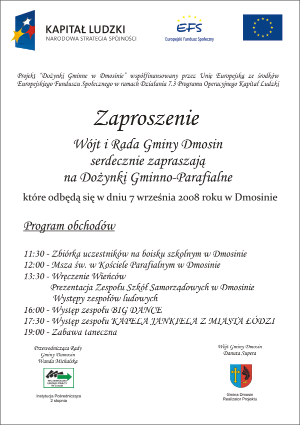 W tym roku środki finansowe na tę uroczystość będą pochodziły z Europejskiego Funduszu Społecznego w ramach Programu Operacyjnego Kapitał Ludzki Priorytet 7.3 – Inicjatywy Lokalne na rzecz aktywnej integracji.